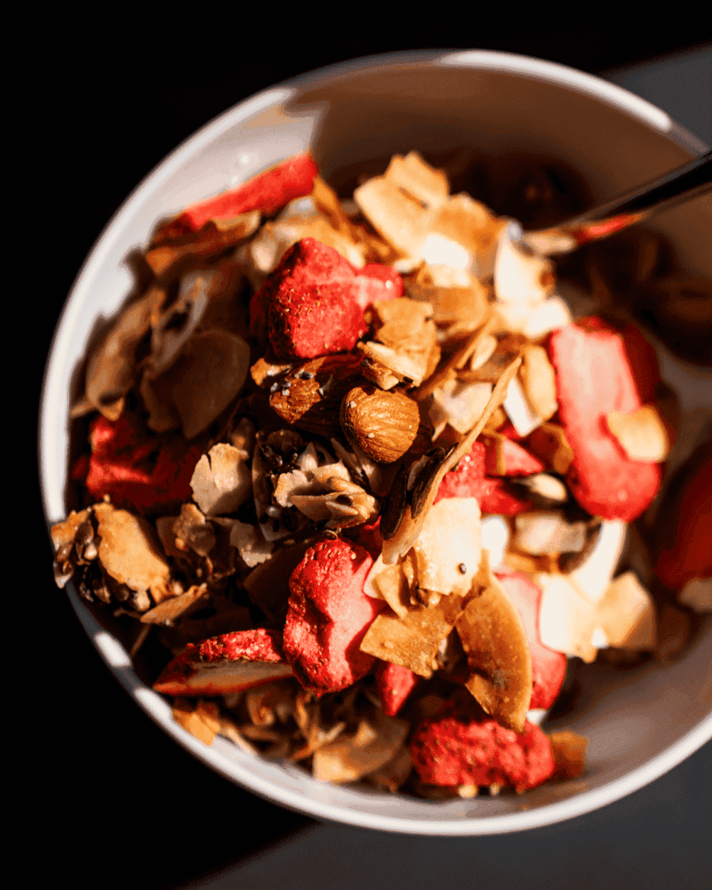 Coconut chips, almonds, sunflower seeds, pumpkin seeds, chicory fiber, flax seeds, macadamia nuts, freeze-dried strawberries, chia seeds, salt.